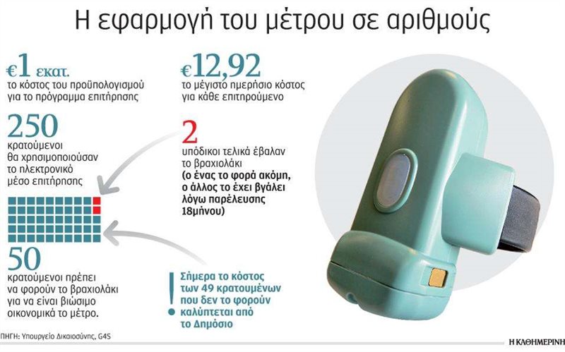 Στην Ελλάδα, ωστόσο, εφαρμόστηκε μια πιο συντηρητική και πιο οικονομική προσέγγιση. Το βραχιολάκι συμπληρώνει το μέτρο του κατ’ οίκον περιορισμού, εξασφαλίζοντας παράλληλα ότι δεν θα απασχολούνται αστυνομικοί για την επιτήρηση του κρατουμένου. Το μέτρο προβλέπεται για κατάδικους ή υπόδικους ήπιας εγκληματικότητας στους οποίους έχει επιβληθεί ποινή κάθειρξης έως 10 έτη. Ακόμη ο νόμος προβλέπει ότι το ημερήσιο κόστος χρήσης του καλύπτεται από το Δημόσιο για όποιον κρατούμενο αδυνατεί να πληρώσει.