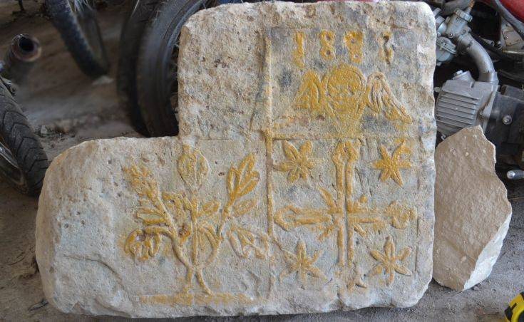 - Ένα μαρμάρινο αρχιτεκτονικό μέλος ανωδομής με έγγλυφη διακόσμηση, με μήκους σαράντα ένα εκατοστών