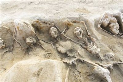 Η εικόνα ωστόσο που κυριαρχεί είναι της ομαδικής ταφής των δεσμωτών. Είναι τοποθετημένοι ο ένας δίπλα στον άλλον, ορισμένοι με το πρόσωπο προς το έδαφος και έχουν τα δεσμά περασμένα στα χέρια.