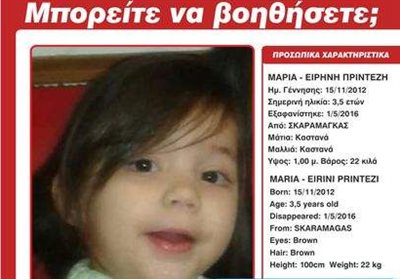 Ονοματεπώνυμο: MAΡΙΑ-ΕΙΡΗΝΗ ΠΡΙΝΤΕΖΗ Ημερομηνία γέννησης:15/11/2012 Χρώμα μαλλιών: Καστανά Χρώμα ματιών: Καστανά Ημερομηνία εξαφάνισης: 1/5/2016 Στις 01/05/16 στις 14.40, εξαφανίστηκε από την περιοχή του Σκαραμαγκά, η Μαρία- Ειρήνη Πρίντεζη, 3,5 ετών. Η Μαρία- Ειρήνη έχει καστανά μακριά μαλλιά, καστανά μάτια, έχει ύψος 1,00 μέτρο και ζυγίζει 22 κιλά. Φορούσε ροζ μπλούζα, ροζ παντελόνι και ροζ αθλητικά παπούτσια. Λόγω της μικρής ηλικίας του παιδιού και των συνθηκών εξαφάνισης υπάρχουν ενδείξεις ότι το παιδί κινδυνεύει.