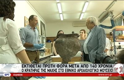 Η μεταφορά και η τοποθέτηση του αγγείου σε ειδική γυάλινη προθήκη στη μεγάλη αίθουσα του βωμού, όπου εκτίθενται όλα τα αντικείμενα του «Αθέατου Μουσείου», έγιναν παρουσία του υπουργού Πολιτισμού Αριστείδη Μπαλτά.