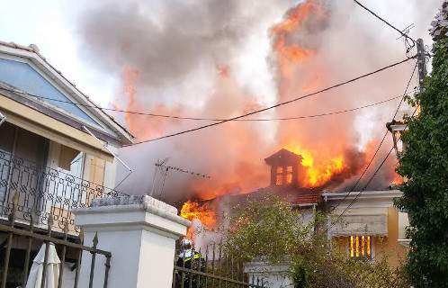 Όλη η δύναμη της πυροσβεστικής προσπαθεί να σβήσει τη φωτιά αλλά η φωτιά είναι ανεξέλεγκτη.