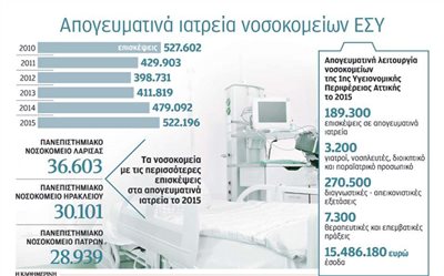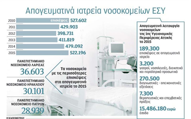 Το 2015 τις περισσότερες επισκέψεις στα απογευματινά ιατρεία των νοσοκομείων της Αθήνας δέχθηκε το εξειδικευμένο στα δερματικά και αφροδισιολογικά νοσήματα «Ανδρέας Συγγρός» (26.711 επισκέψεις) και ακολούθησαν το ΚΑΤ που έχει ειδικό προσανατολισμό στα ορθοπεδικά περιστατικά (20.919 επισκέψεις) και το «Ελενα Βενιζέλου» (16.667 επισκέψεις), αφήνοντας πίσω το Γενικό Κρατικό Αθηνών (16.206 επισκέψεις) και τον «Ευαγγελισμό» (11.743). Ωστόσο ο «Ευαγγελισμός» είναι ο πρωταθλητής των εσόδων από την απογευματινή λειτουργία, όχι όμως λόγω των επισκέψεων στους γιατρούς, αλλά λόγω των ακριβών διαγνωστικών-απεικονιστικών εξετάσεων. Από τα 15,5 εκατομμύρια ευρώ έσοδα από τα απογευματινά των νοσοκομείων της Αθήνας, τα 3 εκατομμύρια ευρώ είναι του «Ευαγγελισμού», που είναι και το μόνο νοσοκομείο ΕΣΥ στο Λεκανοπέδιο που διαθέτει PET-CT (τομογραφία εκπομπής ποζιτρονίων).