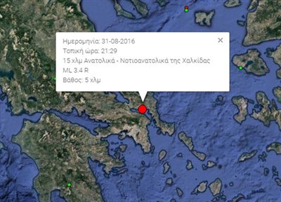 Ασθενής σεισμική δόνηση σημειώθηκε στις 21:29 το βράδυ της Τετάρτης (31/8/2016) στην Εύβοια. Σύμφωνα με την αυτόματη λύση του Γεωδυναμικού Ινστιτούτου ο σεισμός είχε ένταση 3,4 της κλίμακας Ρίχτερ το επίκεντρο του σεισμού εντοπίστηκε 15χλμ νότια νοτιοανατολικά της Χαλκίδας ενώ το εστιακό βάθος του σεισμού υπολογίζεται στα 5χλμ.
