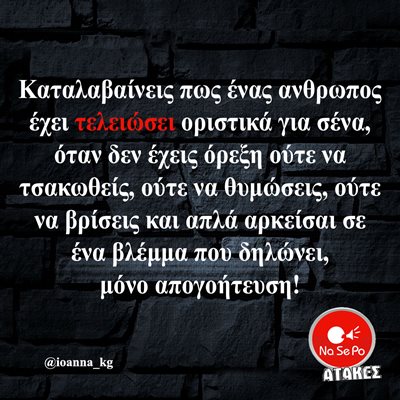 Καταλαβαίνεις πως ένας ανθρωπος έχει τελειώσει οριστικά για σένα, όταν δεν έχεις όρεξη ούτε να τσακωθείς, ούτε να θυμώσεις, ούτε να βρίσεις και απλά αρκείσαι σε ένα βλέμμα που δηλώνει, μόνο απογοήτευση! @ioanna_kg