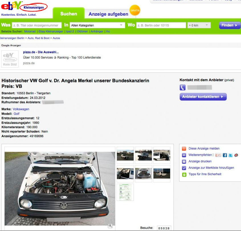 Το γερμανικό περιοδικό Der Spiegel εκτιμά ότι η αγγελία είναι αξιόπιστη, καθώς η διεύθυνση που αναφέρεται στην άδεια κυκλοφορίας είναι η πραγματική διεύθυνση της κατοικίας της Μέρκελ, ενώ σύμφωνα με τα στοιχεία εκείνη την εποχή η γερμανίδα καγκελάριος οδηγούσε ένα λευκό Golf.
