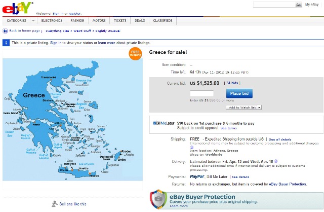 Προκλητικά δημοσιεύματα στα διεθνή μέσα ενημέρωσης φέρουν τη γνωστή ιστοσελίδα ηλεκτρονικού εμπορίου Ebay... να βάζει πωλητήριο στην Ελλάδα, με τιμή εκκίνησης στα 1.525 δολάρια!