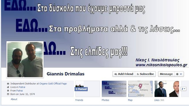 Έντονο προβληματισμό έχει προκαλέσει στη Συγγρού, η αποκάλυψη ενός χρήστη του Facebook, o οποίος δέχτηκε ένα προκλητικότατο μήνυμα από τον πολιτευτή της ΝΔ στην Πάτρα Γιάννη Δριμάλα.Ο καταγγέλλων αναφέρει παρακάτω πως έγιναν όλα: «o Κύριος Giannis Drimalas πολιτευτής της ΟΝΝΕΔ & της ΝΔ ο οποίος μου έστειλε αίτημα φιλίας, με αφορμή ανάρτηση στον τοίχο του όπου έγραψε αυτολεξεί τα λόγια του Αντώνη Σαμαρά στην πολιτική διαφήμιση της ΝΔ όπου και καταλήγει «ΜΑΖΙ ΘΑ ΤΑ ΚΑΤΑΦΕΡΟΥΜΕ» και του απάντησα «Πάλι σήμερα είχαμε 3 αυτοκτονίες Γιάννη. Έχει δίκιο ο Σαμαράς. Θα τα καταφέρουμε. Να μην μείνει κανένας ζωντανός» μου έστειλε το ακόλουθο μήνυμα στα εισερχόμενά μου:«kalhspera!!!epidi den me 3ereis kai den se 3erw … gia na min paragnwristoume 8a protimousa na min 3anasxoliaseis ston teixo mou …. sta @@ mou an pe8anan – autoktonisan – skwto8ikan …. opws kai esena sta @@ sou an skwto8ikan 1000 stin tinisia ton perasmeno mhna!!! mporeis na kaneis oti goustareis stis ekloges apla min me enoxleis….. euxaristw gia ton xrono sou!» aniwthoi