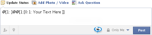 1. Πηγαίνετε στο status (κατάσταση) 2. Αντιγράψτε και επικολλήστε εκεί το κείμενο: @[1: ]@@[1:[0:1: Your Text Here ]] 3. Σβήστε το "Your Text Here" και γράψτε το μήνυμά σας 4. Πατήστε "Δημοσίευση" (Post) και είστε έτοιμοι! Οι φίλοι σας θα δουν αυτό που γράψατε με μπλε χαρακτήρες!