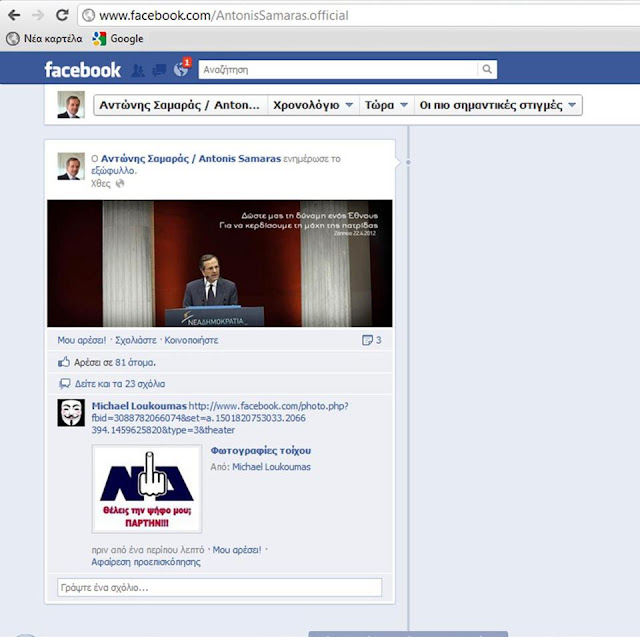 Ο Διαδικτυακός "Λουκουμάς" ξαναχτύπησε σε πολιτικές ιστοσελίδες.. Δείτε τι έγραψε στον τοίχο του Πύρρου Δήμα αλλα και του Αντώνη Σαμαρά!! olympia.gr