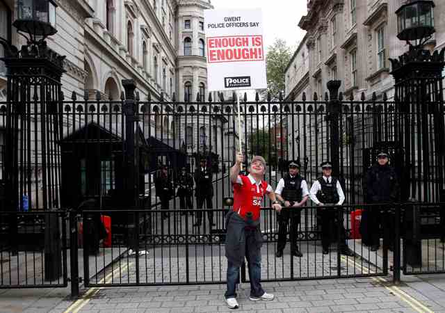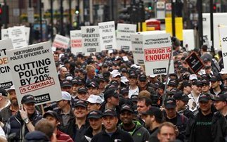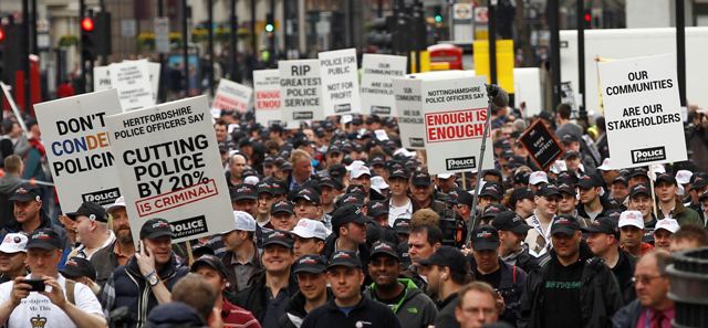 Χιλιάδες βρετανοί αστυνομικοί βγήκαν σήμερα στους δρόμους για να διαμαρτυρηθούν κατά της επιβολής ανώτατων ορίων στους μισθούς τους, των μεταρρυθμίσεων στις συντάξεις και άλλων μέτρων λιτότητας, στις οποίες πήραν μέρος μαζικά οι δημόσιοι υπάλληλοι.