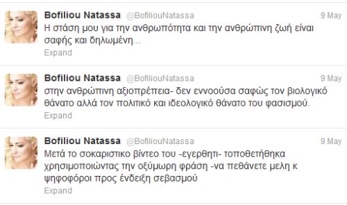 Σάλο προκάλεσε η Νατάσσα Μποφίλιου, μετά το χτεσινό αμφιλεγόμενο τουιτάρισμά της, όπου χαρακτήριζε «κτήνη» και «αλήτες» τους Χρυσαυγίτες και ευχόταν «να πεθάνουν».
