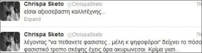 «Το να εκφράζεις το θυμό που έχεις από το αποτέλεσμα των εκλογών που έγιναν καθαρά με δημοκρατικό τρόπο λέγοντας ''να πεθάνετε φασίστες , μέλη κ ψηφοφόροι'' δείχνει το πόσο φασιστικό τρόπο σκέψης έχεις άρα ακυρώνεσαι. Κρίμα γιατί... είσαι αξιοσέβαστη καλλιτέχνης...», έγραψε η Χρύσπα. radar