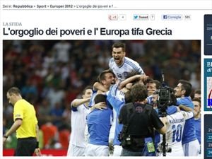 «Η αξιοπρέπεια των φτωχών, η Ευρώπη στηρίζει την Εθνική Ελλάδας», γράφει η ιταλική εφημερίδα Λα Ρεπούμπλικα, προσθέτοντας: «Έλληνες κατά Γερμανών και υπόλοιπη Ευρώπη κατά Γερμανών, φτωχά νομίσματα και οικονομική περιφέρεια κατά των Γερμανών».