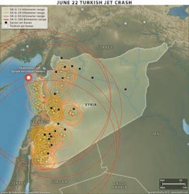 Ο χάρτης που δημοσιεύει το STRATFOR είναι διαφωτιστικός και δείχνει το σημείο στο οποίο καταρρίφθηκε το RF 4 αλλά και όλο το "σύμπλεγμα" της συριακής αεράμυνας.Στο χάρτη μπορείτε να δείτε όλα τα πυραυλικά συστήματα που διαθέτουν οι Σύριοι.Από αυτά προκύπτει ότι όλα "είχαν" στο βεληνεκές τους το φωτογραφικό των Τούρκων.