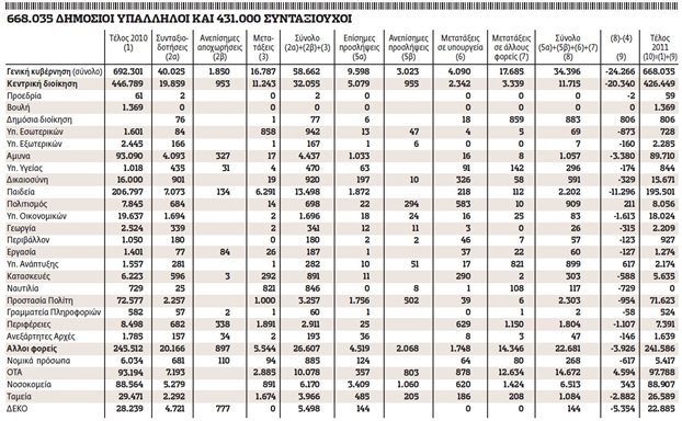 Σύμφωνα με την έκθεση που έχει στα χέρια του ο υπηρεσιακός υπουργός Οικονομικών κ. Γιώργος Ζανιάς στη νέα πολιτική ηγεσία του υπουργείου Οικονομίας και η οποία αποτέλεσε και τη βάση των συζητήσεων ανάμεσα στα τρία κόμματα που στηρίζουν την κυβέρνηση για να καταλήξουν στην προγραμματική συμφωνία, προκύπτει ότι το 2010 κι ενώ συνταξιοδοτήθηκαν 53.336 εργαζόμενοι ο συνολικός αριθμός του μόνιμου προσωπικού του στενού και ευρύτερου δημόσιου τομέα (της γενικής κυβέρνησης) έμεινε σχεδόν σταθερός στις 692.301 άτομα. Το σύνολο σχεδόν των κενών θέσεων καλύφθηκε με νέες προσλήψεις.