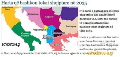 Χάρτης που δημοσιεύθηκε σε ορισμένα αμερικανικά και ρωσικά μέσα ενημέρωσης, έφεραν στην επιφάνεια την ενοποίηση της Αλβανίας με το Κοσσυφοπέδιο με την προσάρτηση ορισμένων εδαφών από τα Σκόπια, τη Σερβία, το Μαυροβούνιο κλπ. όπως δημοσιεύεται στο αλβανικό πρακτορείο ΙΝΑ.