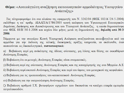Ομοίως, μια εταιρεία που συμμετέχει σε ένα διαγωνισμό δήμου ας πούμε, ΑΠΑΓΟΡΕΥΕΤΑΙ να τρέχει για να πάρει "Βεβαίωση για τις τροποποιήσεις του καταστατικού Ανώνυμης Εταιρίας" π.χ. ή "Βεβαίωση για την εκπροσώπηση Ανώνυμης Εταιρίας". Τα δικαιολογητικά αυτά πρέπει να τα αναζητεί αυτεπαγγέλτως ο δήμος (Ο.Τ.Α.) ή η περιφέρεια ή άλλη δημόσια υπηρεσία.