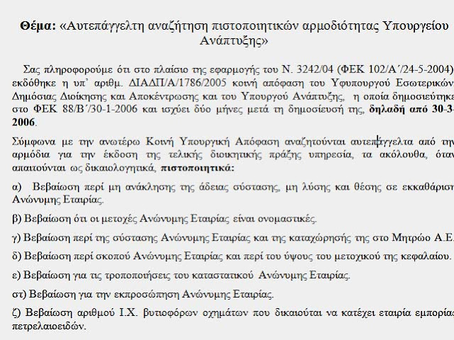 Όπως έχετε ενημερωθεί και με προηγούμενες εγκυκλίους της υπηρεσίας μας, στο πλαίσιο της εφαρμογής των διατάξεων του Ν. 3242/04 (ΦΕΚ 102/Α΄) και του Ν. 3448/2006 (ΦΕΚ 57/Α΄), εκδόθηκαν τρείς (3) κοινές υπουργικές αποφάσεις, σύμφωνα με τις οποίες αναζητούνται υποχρεωτικά από τις οργανικές μονάδες των Υπουργείων, των αυτοτελών Δημοσίων Υπηρεσιών, των Οργανισμών Τοπικής Αυτοδιοίκησης α΄ και β΄ βαθμού και των Νομικών Προσώπων Δημοσίου Δικαίου, τα παρακάτω δικαιολογητικά :