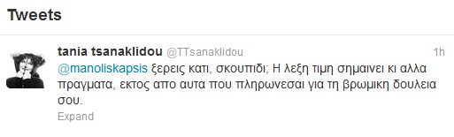Σφοδρή επίθεση εξαπέλυσε μέσω twitter η Τάνια Τσανακλίδου προς τον Μανώλη Καψή, σύμφωνα με το newsbeast, για τα σχόλια που δημοσίευσε στον προσωπικό του λογαριασμό στο twitter, εναντίον της Χαρούλας Αλεξίου και της Δήμητρας Γαλάνη.