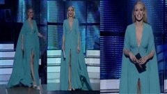 Με την αίγλη και το glam της δεκαετίας του 70 η Ζέτα, ανέδειξε το βαθύ ντεκολτέ και το αποκαλυπτικό σκίσιμο, ενός απόλυτα σέξι και εντυπωσιακού φορέματος με ιδιαίτερα μανίκια. Οι studded peep toe γόβες της με λεπτομέρεια από ταρταρούγα, φέρουν την υπογραφή Christian Louboutin (από το Enny di Monaco) ενώ τα κοσμήματά της ανήκουν στη συλλογή Panther του οίκου Cartier.