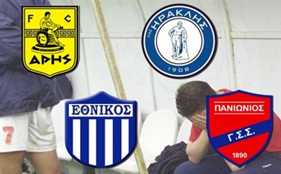 Ιστορικά σωματεία, ωστόσο, με "βαριά φανέλα" και "βαριά ιστορία" υποβιβάστηκαν από την πρώτη κατηγορία και υπέστησαν το ηχηρό "ηλεκτροσόκ" πριν από την ΑΕΚ. Η περίπτωση του ΗρακλήΠρώτος έκανε την αρχή ο Ηρακλής. Η ομάδα της Θεσσαλονίκης δεν είχε μέχρι τη σεζόν 1979/80 υποβιβαστεί ποτέ στην ιστορία της. Μάλιστα, το 1976 σήκωσε το κύπελλο Ελλάδος, στην κορυφαία στιγμή της... αρμάδας του "Νουρέγιεφ" Βασίλη Χατζηπαναγή.1979: Η δήθεν δωροδοκία του κυπέλλουΤη σεζόν 1979/80 ηττήθηκε με σκορ 5-2 στον τελικό του κυπέλλου Ελλάδος από την Καστοριά. Την ίδια χρονιά, ο Ηρακλής υποβιβάστηκε, καθώς θεωρήθηκε ο μόνος υπαίτιος, μετά από σκάνδαλο στημένων αγώνων της ίδιας χρονιάς.Συγκεκριμένα, ο ποδοσφαιριστής του ΠΑΟΚ, Φιλώτας Πέλλιος, κατήγγειλε ότι ο τότε πρόεδρος του Ηρακλή, Κώστας Περτσινίδης, επιχείρησε να τον δωροδοκήσει για να έχει μειωμένη απόδοση στη ρεβάνς του ημιτελικού του κυπέλλου μεταξύ των δύο ομάδων.Οι κατηγορίες δεν επιβεβαιώθηκαν νομικά, ωστόσο ο Ηρακλής υποβιβάστηκε στη Β' Εθνική, όπου αγωνίστηκε τη σεζόν 1980/81. Παράγοντες και φίλαθλοι της ομάδας έφτασαν μέχρι τον τότε πρωθυπουργό, Γεώργιο Ράλλη, για να ζητήσουν την προσωπική παρέμβασή του για την ηθική αποκατάσταση του συλλόγου.Τελικά, οι κυανόλευκοι συμβιβάστηκαν με τη μοίρα τους. Ένα χρόνο αργότερα, βέβαια, το δικαστήριο δικαίωσε τον Ηρακλή με τελεσίδικη απόφαση και το όνομά του αποκαταστάθηκε στη συνείδηση των Ελλήνων φιλάθλων, όχι όμως και η βλάβη από τον υποβιβασμό. Ο Γηραιός, ωστόσο, έστω και χωρίς τον Βασίλη Χατζηπαναγή, επέστρεψε... τρένο στη φυσική του θέση, την Α' Εθνική, αφού τερμάτισε εύκολα πρώτος και έχασε μόλις μία χρονιά.2011: Η πλαστή ασφαλιστική ενημερότηταΤο 2011, με αποφάσεις των αρμόδιων αθλητικών οργάνων, ο Ηρακλής γνώρισε τρεις διαδοχικούς υποβιβασμούς μέσα σε διάστημα λίγων μηνών, καταλήγοντας από την πρώτη κατηγορία του πρωταθλήματος στην τέταρτη, παρόλο που αγωνιστικά είχε κατορθώσει να κερδίσει την παραμονή του στην πρώτη κατηγορία του πρωταθλήματος. Στις 12 Μαΐου 2011, ο πρόεδρος της ΕΠΟ, Σοφοκλής Πιλάβιος, γνωστοποίησε στην επιτροπή μορφωτικών υποθέσεων της Βουλής πως ο Ηρακλής είχε καταθέσει πλαστή ασφαλιστική και φορολογική ενημερότητα, για να μπορέσει να πραγματοποιήσει μεταγραφές κατά την μεταγραφική περίοδο του Ιανουαρίου.Για το γεγονός της πλαστής ενημερότητας, ο Αστέρας Τρίπολης, που είχε τερματίσει 14ος στο πρωτάθλημα και υποβιβαζόταν, προχώρησε σε καταγγελία προς την Πειθαρχική Επιτροπή της Σούπερ Λιγκ, σε βάρος του Ηρακλή, ζητώντας να αφαιρεθούν από την ομάδα της Θεσσαλονίκης επτά βαθμοί από το πρωτάθλημα.Η πειθαρχική επιτροπή της Superleague αποφάσισε υποβιβασμό του Ηρακλή διά της κατάληψης της τελευταίας θέσης στον βαθμολογικό πίνακα του πρωταθλήματος. Με την απόφαση αυτή, ο Αστέρας Τρίπολης καταλάμβανε τη 13η θέση και παρέμενε στην πρώτη κατηγορία.Από τον Ιανουάριο του 2012, ο Ηρακλής αγωνιζόταν υπό το όνομα Α.Ε.Π. Ηρακλής 1908 στην τρίτη κατηγορία του ποδοσφαίρου ανδρών (Football League 2, 2ος όμιλος), αφότου συγχωνεύτηκε με την Α.Ε. Ποντίων Κατερίνης. Λίγες ημέρες πριν την έναρξη του πρωταθλήματος της Football League της σεζόν 2012/13, στις 12 Σεπτεμβρίου 2012, το συμβούλιο της Football League - Football League 2 δέχτηκε το αίτημα της Ελληνικής Ποδοσφαιρικής Ομοσπονδίας να διοργανωθεί το πρωτάθλημα με τρεις ομάδες επιπλέον, τον Ολυμπιακό Βόλου, την Καβάλα και τον Ηρακλή(25), στο πλαίσιο της αναδιάρθρωσ