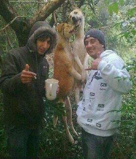 Οι δύο φίλοι φαίνονται ιδιαίτερα ικανοποιημένοι από το «κατόρθωμά» τους αφού ποζάρουν χαμογελαστοί μπροστά από τα δύο κρεμασμένα, νεκρά σκυλιά. Για την δολοφονία των δύο σκύλων κατηγορείται ο ισπανός τραγουδιστής Cumbiero.