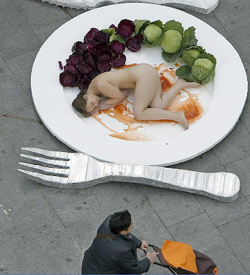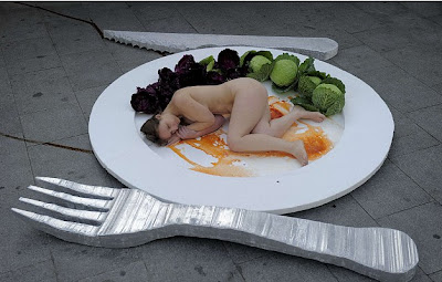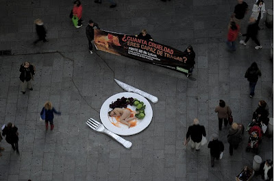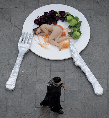 Η νεαρή κοπέλα ξάπλωσε γυμνή σε ένα τεράστιο πιάτο σε κεντρική πλατεία της Ισπανίας στο οποίο υπήρχαν επίσης λαχανικά ενώ είχε φτιάξει και μια προσομοίωση αίματος στην προσπάθεια της να ευαισθητοποιήσει τους κρεατοφάγους.