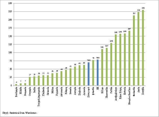 Αριθμός πληρωμών με κάρτα ανά κάτοικο και ανά έτος (2012)