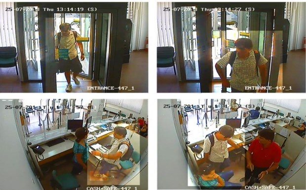 Τέσσερις φωτογραφίες, που απεικονίζουν άγνωστο δράστη (συνεργό των προαναφερομένων), ο οποίος συμμετείχε στην ένοπλη ληστεία σε υποκατάστημα τράπεζας στην Κλειτορία Αχαΐας, την 10-03-2014.