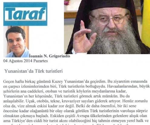 Συγκεκριμένα ο κ Ιωάννης Ν Γρηγοριάδης, σε επίμαχο άρθρο του στην τουρκική εφημερίδα, Taraf, στη οποία αρθρογραφεί συχνά άρθρα που διακρίνονται για την… άνευ όρων επιβολή μιας ελληνοτουρκικής φιλίας, εξαπολύει έντονη επίθεση κατά του Παναγιώτατου Μητροπολίτη Θεσσαλονίκης κ Άνθιμου, για τις πρόσφατες δημόσιες δηλώσεις του για τους Τούρκους τουρίστες που ήρθαν στην Θεσσαλονίκη. Παράλληλα επικρίνει τον Παναγιώτατο και για τις δηλώσεις του ενάντια στον κ δήμαρχο της Θεσσαλονίκης, γενέτειρας του Μουσταφά Κεμάλ Ατατούρκ, ο οποίος δήμαρχος, όπως είναι γνωστό, είναι αυτός που φιλοδοξεί να καταστήσει την Θεσσαλονίκη Κέντρο Ισλαμικού Πολιτισμού, να ανοίξει σε μόνιμη βάση μουσουλμανικό τέμενος αναγνωρίζοντας έτσι την ύπαρξη μουσουλμανικής μειονότητας στην πόλη και να δημιουργήσει μουσουλμανικό νεκροταφείο για τους… «χιλιάδες» μουσουλμάνους της ευρύτερης περιοχής.