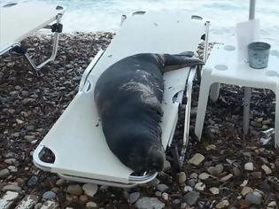 Μία ευχάριστη έκπληξη περίμενε σήμερα το πρωί τους λουόμενους στην παραλία της Γάγκου στη Σάμο, καθώς η μικρή φώκια που τους τελευταίους μήνες παρουσιάζεται σε διάφορες περιοχές του νησιού εθεάθη για πρώτη φορά ξαπλωμένη σε… σεζλόνγκ.