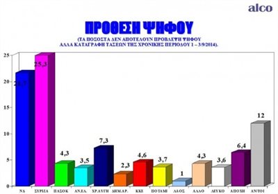 Σύμφωνα με τη δημοσκόπηση της εταιρείας Alco για λογαριασμό της εφημερίδας Το Ποντίκι, ο ΣΥΡΙΖΑ προηγείται κατά 3,6% στην πρόθεση ψήφου συγκεντρώνοντας ποσοστό 25,3% και η Νέα Δημοκρατία ακολουθεί με ποσοστό 21,7%. Τρίτη πολιτική δύναμη αναδεικνύεται η Χρυσή Αυγή με ποσοστό 7,3%, ενώ στην τέταρτη θέση βρίσκεται το ΚΚΕ με ποσοστό 4,6%.