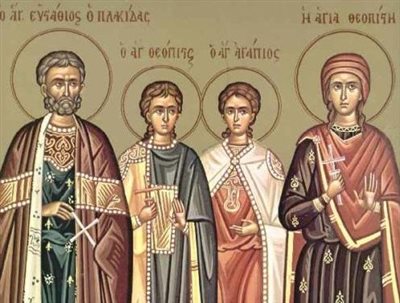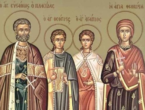 Γιορτάζουμε σήμερα 20 Σεπτεμβρίου, ημέρα μνήμης των Αγίων Ευσταθίου, της συζύγου του Θεοπίστης και των δύο παιδιών του Αγαπίου και Θεοπίστου.