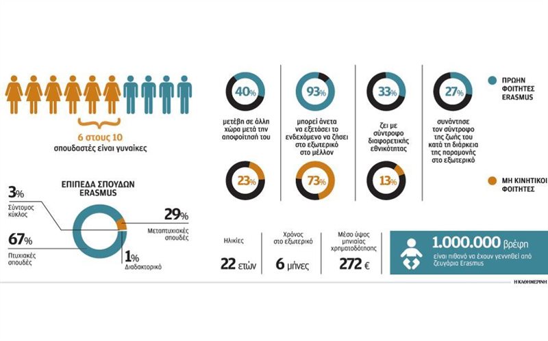 Εξαιρετικά δημοφιλές αναδεικνύεται το πρόγραμμα Erasmus στην Ελλάδα, καθώς δίνει διέξοδο στο ανήσυχο πνεύμα των φοιτητών, διασφαλίζοντάς τους, μάλιστα, μια μέση μηνιαία χρηματοδότηση 272 ευρώ. Οι πρώτοι 37 Ελληνες που ανταποκρίθηκαν το 1987-88 στην (τότε) πρόκληση έφτασαν τις 4.908 την ακαδημαϊκή χρονιά 2012-13, αριθμός που περιλαμβάνει φοιτητές που μετέβησαν για σπουδές ή πρακτική στο εξωτερικό, αλλά και μέλη του διδακτικού ή διοικητικού προσωπικού και υπαλλήλους επιχειρήσεων, που δίδαξαν ή παρακολούθησαν προγράμματα επιμόρφωσης. Το διάστημα 2007-2013 οι πρώτες επιλογές των Ελλήνων για σπουδές και επιμόρφωση ήταν η Γαλλία, που υποδέχθηκε 2.875 άτομα, η Ισπανία (2.601) και η Γερμανία (2.260). Από την άλλη, για πρακτική άσκηση προτιμήθηκαν η Γερμανία (426), η Ισπανία (388) και το Ηνωμένο Βασίλειο (384).