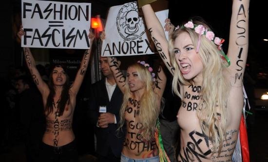 Με συνθήματα «Fashion = Fascism» και «Ανορεξία» στα γυμνά στήθη τους και κρατώντας πλακάτ προσπάθησαν να δώσουν το ηχηρό μήνυμά τους, ενώ οι αστυνομικές αρχές τις παρεμπόδισαν από το να εισβάλουν στην επίδειξη που εκείνη την ώρα διοργανωνόταν στο κτίριο.