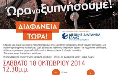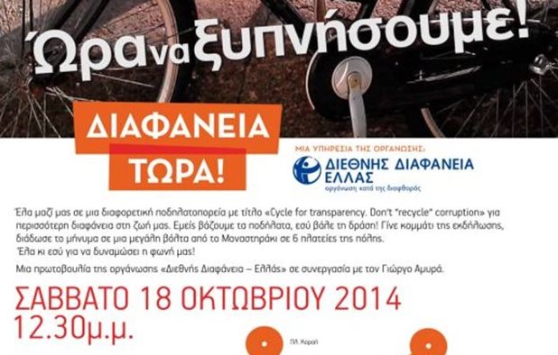 Η Διεθνής Διαφάνεια βάζει τα ποδήλατα και όσοι θέλουν ποδηλατούν με επικεφαλής το Γιώργο Αμυρά από το Μοναστηράκι σε έξι πλατείες της Αθήνας πρεσβεύοντας το μήνυμα «Cycle for transparency. Don’t “recycle” corruption».