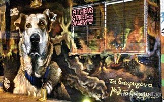 Ένα γκράφιτι που απεικονίζει τον Λουκάνικο, τον αγαπημένο σκύλο – διαδηλωτή, κοσμεί πλέον την περιοχή του Ψυρρή στο κέντρο της Αθήνας.
