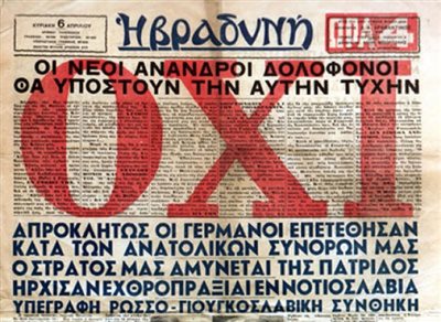 Το πρωτοσέλιδο της εφημερίδας «ΕΛΛΗΝΙΚΟ ΜΕΛΛΟΝ» στις 28 Οκτωβρίου 1940