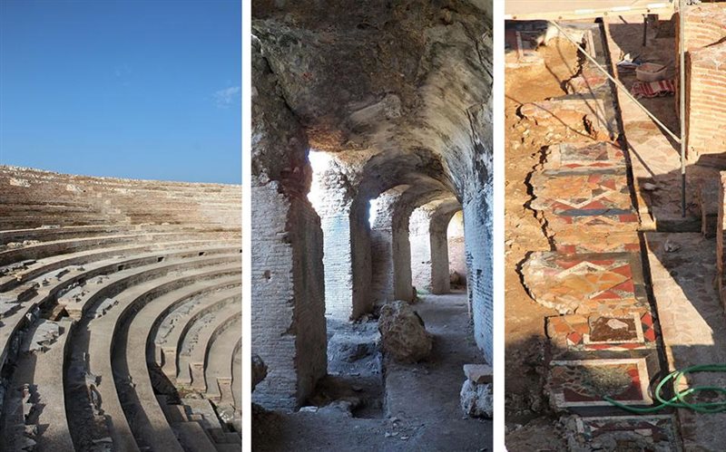 Aπό αριστερά: Αποψη του δυτικού κοίλου κατά την ολοκλήρωση των εργασιών αποκατάστασης. Το δυτικό τμήμα της περιμετρικής στοάς πριν από τις εργασίες στερέωσης. Διατηρούμενα τμήματα του διακοσμητικού μαρμαροθετήματος της ορχήστρας κατά τον καθαρισμό τους. (Αρχείο Ε.Ε. Νικόπολης).