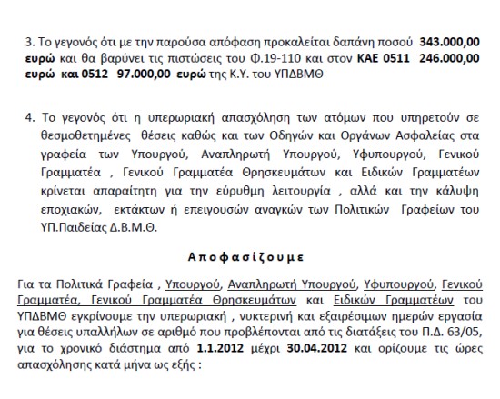 καθώς με υπογραφή της υπουργού κ.Άννας Διαμαντοπούλου εγκρίθηκε η δέσμευση πίστωσης ύψους 343.000 ευρώ, για νδεχόμενες υπερωρίες (μέχρι το τέλος Απριλίου) όσων εργάζονται στα πολιτικά γραφεία του Υπ.Παιδείας. Πιο συγκεκριμένα, σύμφωνα με έγγραφο που αναρτήθηκε στον ιστότοπο της Διαύγειας, προκαλείται δαπάνη ύψους 343.000 ευρώ για την υπερωριακή απασχόληση υπαλλήλων στα Πολιτικά Γραφεία της υπουργού Άννας Διαμαντοπούλου, του αναπληρωτή υπουργού Κωνσταντίνου Αρβανιτόπουλου, της υφυπουργού Εύης Χριστοφιλοπούλου και των γενικών και ειδικών γραμματέων του υπουργείου.