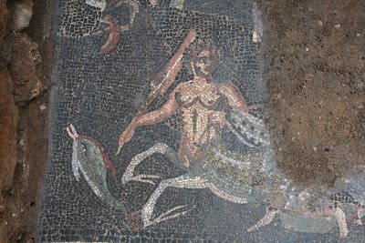 Ετσι, φέτος, με τη σταδιακή αφαίρεση των χωμάτων αποκαλύφθηκε στο ψηφιδωτό ένας θαλάσσιος ίππος με τον Έρωτα να κρατάει τα χαλινάρια του, ένας Έρωτας σκεπτόμενος, ένας μαίανδρος με παραλλαγή, δυο πουλιά με φυτικά μοτίβα, ένας πολύχρωμος κόμβος του Σολομώντα. Η παράσταση περικλείεται από βλαστόσπειρες και κισσόφυλλα, που παραπέμουν σε διονυσιακή λατρεία.