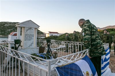 Στη νησίδα Ρω τελέστηκε επιμνημόσυνη δέηση στη μνήμη της Δέσποινας Αχλαδιώτη, της γνωστής «Κυράς της Ρω», αμέσως μετά την οποία ο κ. Δένδιας κατέθεσε στεφάνι στον τάφο της.