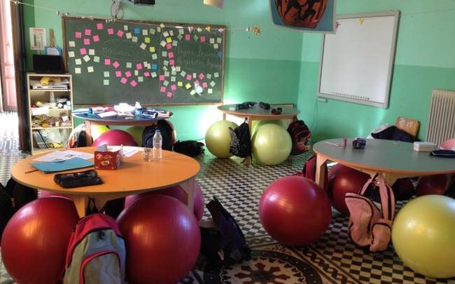 Το εν λόγω δημοτικό σχολείο, που βρίσκεται στο Φουρφουρά της Κρήτης, πέταξε τη Δευτέρα (01/12) τις συνηθισμένες άχρωμες καρέκλες από τις σχολικές τάξεις, και τις αντικατέστησε με πολύχρωμες μπάλες για πιλάτες!