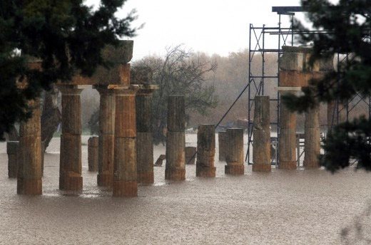 Όπως φαίνεται στις φωτογραφίες οι λάσπες και τα νερά κάλυψαν μέχρι τη μέση τους κίωνες του ναού της Αρτέμιδας μετατρέποντας το χώρο σε... πισίνα!