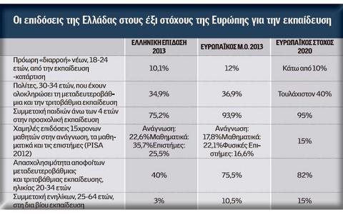 1 Πρόωρη «διαρροή» νέων από την εκπαίδευση - κατάρτιση: Aυτός, είναι ο μοναδικός δείκτης στον οποίο η Eλλάδα έχει εξαιρετική επίδοση. Tο 2013, το ποσοστό των νέων, ηλικίας 18 - 24 ετών, που βρίσκονται εκτός εκπαιδευτικής διαδικασίας -δηλαδή δεν συνεχίζουν τις σπουδές τους στη μεταδευτεροβάθμια και την τριτοβάθμια εκπαίδευση ή δεν συμμετέχουν σε προγράμματα κατάρτισης- ήταν μόλις 10,1% όταν ο ευρωπαϊκός μέσος όρος ήταν 12%. Σημειώνεται ότι στόχος είναι το ποσοστό αυτό να μειωθεί κάτω από το 10% στα κράτη -μέλη της E.E. έως το 2020.