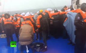 Οι επιβάτες φορώντας τα σωσίβιά τους περιμένουν να επιβιβαστούν στο ελικόπτερο και να σωθούν. Αλλοι φωνάζουν ονόματα φίλων ή συγγενών τους να δουν αν είναι καλά. Κάποιοι είναι κολλημένοι στις άκρες του πλοίου για να αποφύγουν τους καπνούς, αλλά και το κρύο.