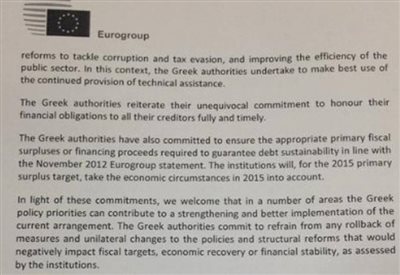 Υπό το φως αυτών των δεσμεύσεων, καλωσορίζουμε ότι σε έναν αριθμό τομέων, οι προτεραιότητες της ελληνικής πολιτικής μπορούν να συνεισφέρουν σε μια ενίσχυση και καλύτερη εφαρμογή της παρούσας συμφωνίας. Οι ελληνικές αρχές δεσμεύονται να απόσχουν από κάθε ανατροπή μέτρων ή μονομερείς αλλαγές στις πολιτικές αυτές και στις διαρθρωτικές μεταρρυθμίσεις που θα είχαν αρνητικές συνέπειες στους δημοσιονομικούς στόχους, στην οικονομική ανάκαμψη ή τη χρηματοπιστωτική σταθερότητα, όπως αξιολογούνται από τους θεσμούς.
