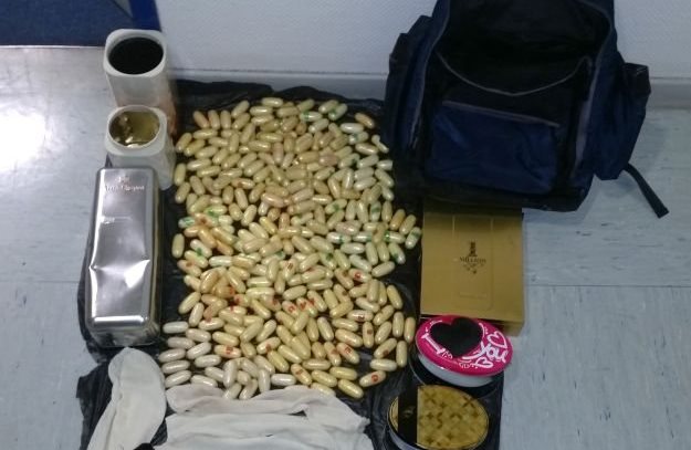 Ο 38χρονος εντοπίστηκε να μεταφέρει ποσότητα κοκαΐνης βάρους 5.940 γραμμαρίων, προερχόμενος από το Σάο Πάολο Βραζιλίας μέσω Ντουμπάι. Η κοκαΐνη βρισκόταν σε σακίδιο πλάτης, μέσα σε πέντε μεταλλικά κουτιά, στο εσωτερικό των οποίων υπήρχαν κάλτσες και εντός αυτών 292 ανισοβαρείς αυτοσχέδιες κυλινδρικές συσκευασίες, περιτυλιγμένες αεροστεγώς με μονωτική ταινία.