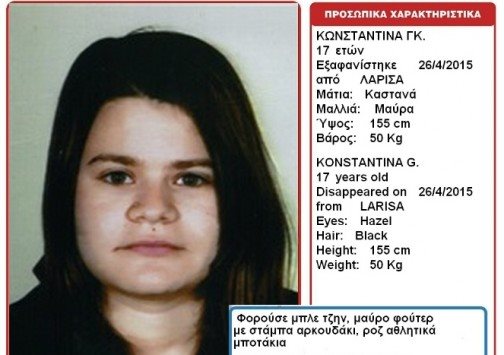 Στις 26 Απριλίου, πρώτες πρωινές ώρες, εξαφανίστηκε η Κωνσταντίνα Γκ., 17 ετών από το σπίτι της στην περιοχή της Χαραυγής στη Λάρισα.